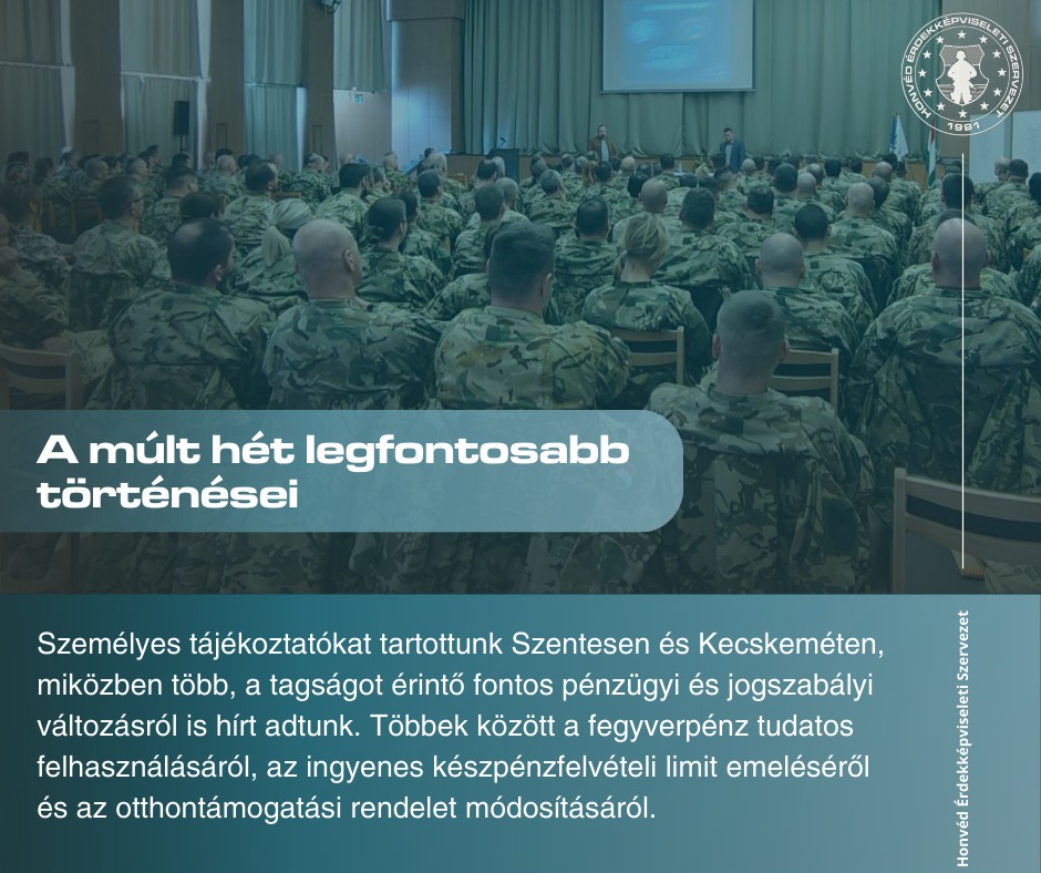 A mögöttünk álló hét ismét tartalmasan telt a Honvéd Érdekképviseleti Szervezet életében. Vezetőségünk több helyszínen is jelen volt, ahol személyes tájékoztatásokkal, egyeztetésekkel és érdekképviseleti munkával képviseltük a tagság érdekeit.