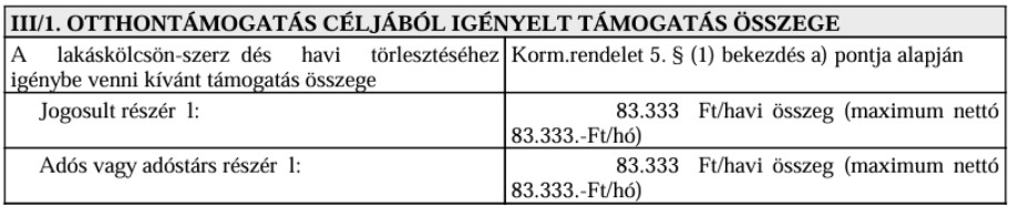 - Az adatoknak az ellenőrizhetőséget (törlesztő részlet/tőke összeg mértéke alapján számított támogatási plafon elérése) is szolgálnia kell, ezért a kitöltés során házastársi jogosultság esetén mindkét adat beírandó az alábbiak szerint: