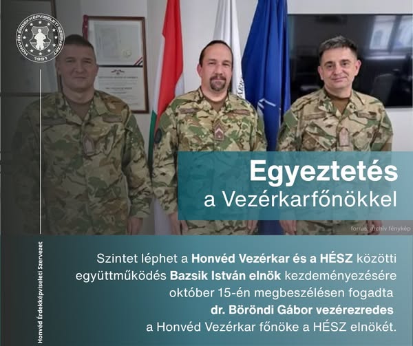 Bazsik István elnök kezdeményezésére október 15-én megbeszélésen fogadta dr. Böröndi Gábor vezérezredes a Honvéd Vezérkar főnöke a HÉSZ elnökét. Az eseményen részt vett Zsíros Tamás MH vezénylő zászlós a Magyar Honvédség vezénylő zászlósa. A megbeszélésen szó esett többek között az ADHU gyakorlat tapasztalatairól, a szolgálati idő beosztás kapcsán megoldandó kérdésekről, a Hjkr. bevezetése óta eltelt időszak tapasztalatairól, illetve az állomány általános hangulatát befolyásoló esetleges tényezőkről. A megbeszélés teljes egészében nyílt, őszinte párbeszéd keretében zajlott, ahol sor kerülhetett a katonák által felvetett és a tárgyalófelek részéről tapasztalt helyzet feltárásra, illetve a stratégiai célok mentén történő jövőbeli feladat megvalósítás aspektusai is szóba kerültek.
